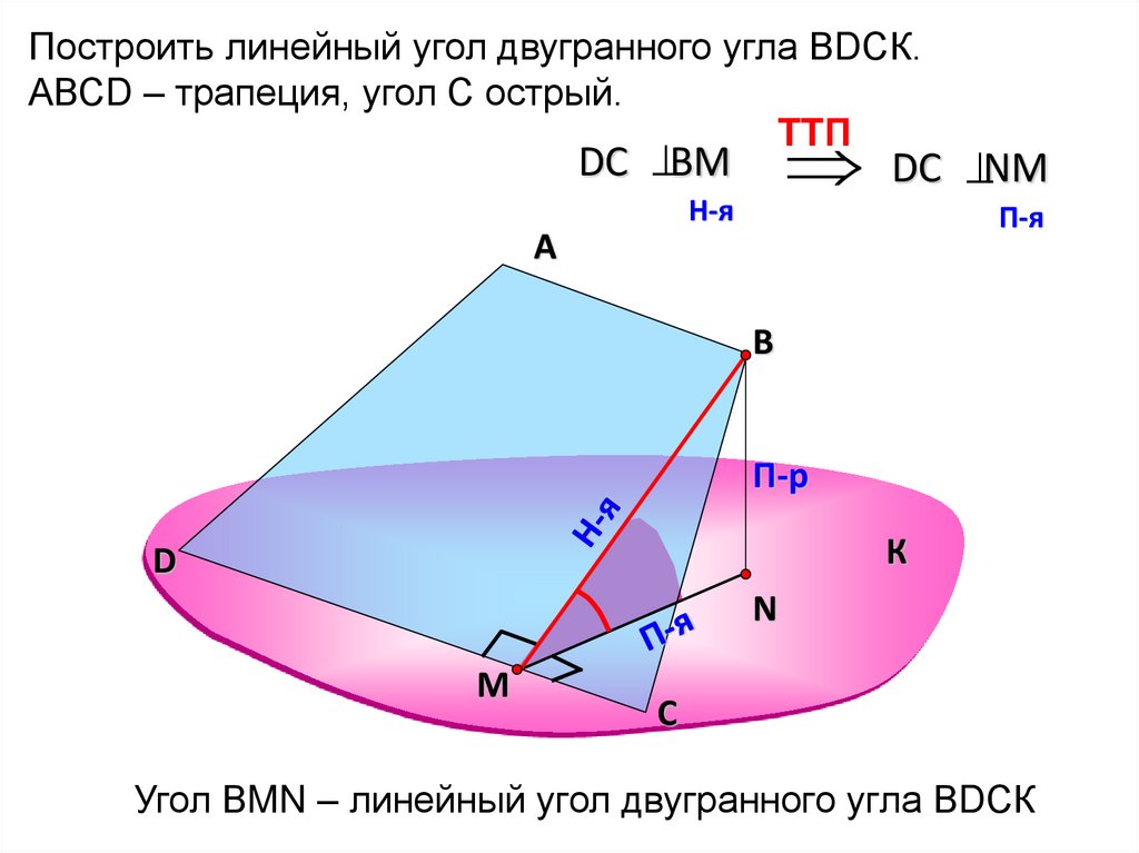 Построить линейный угол двугранного угла ВDСК.АВСD – трапеция, угол С острый.