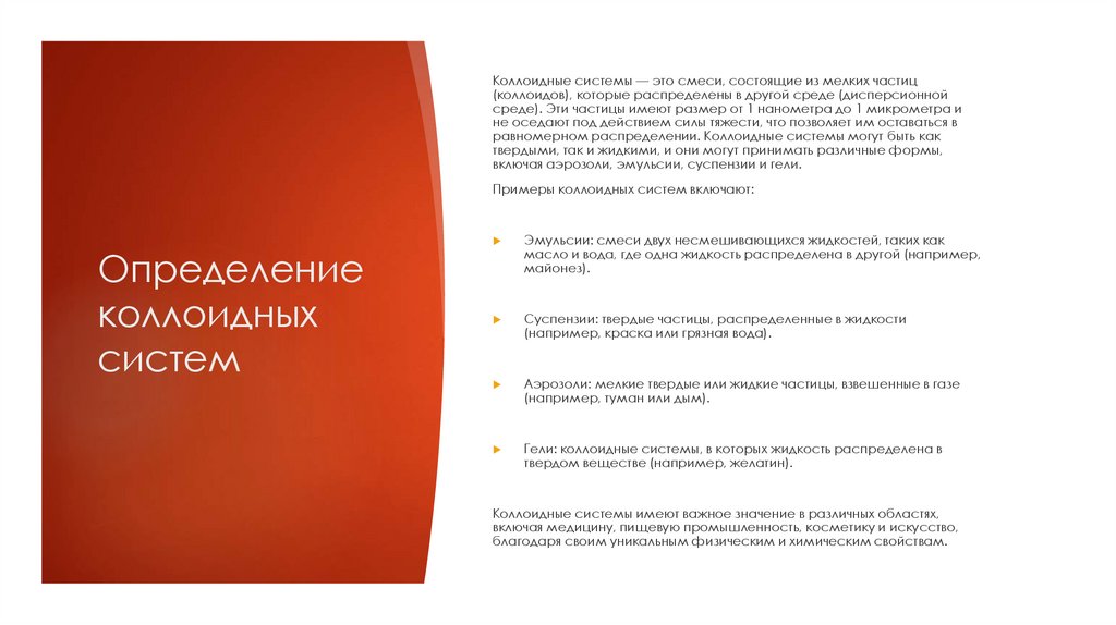 Коллоидные системы — это смеси, состоящие из мелких частиц(коллоидов), которые распределены в другой среде (дисперсионной