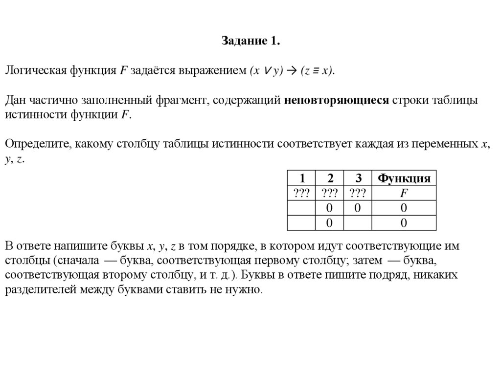 Задание 1.Логическая функция F задаётся выражением (x ∨ y) → (z ≡ x).