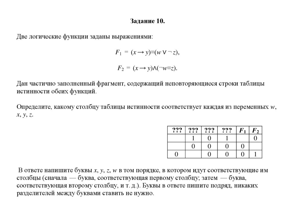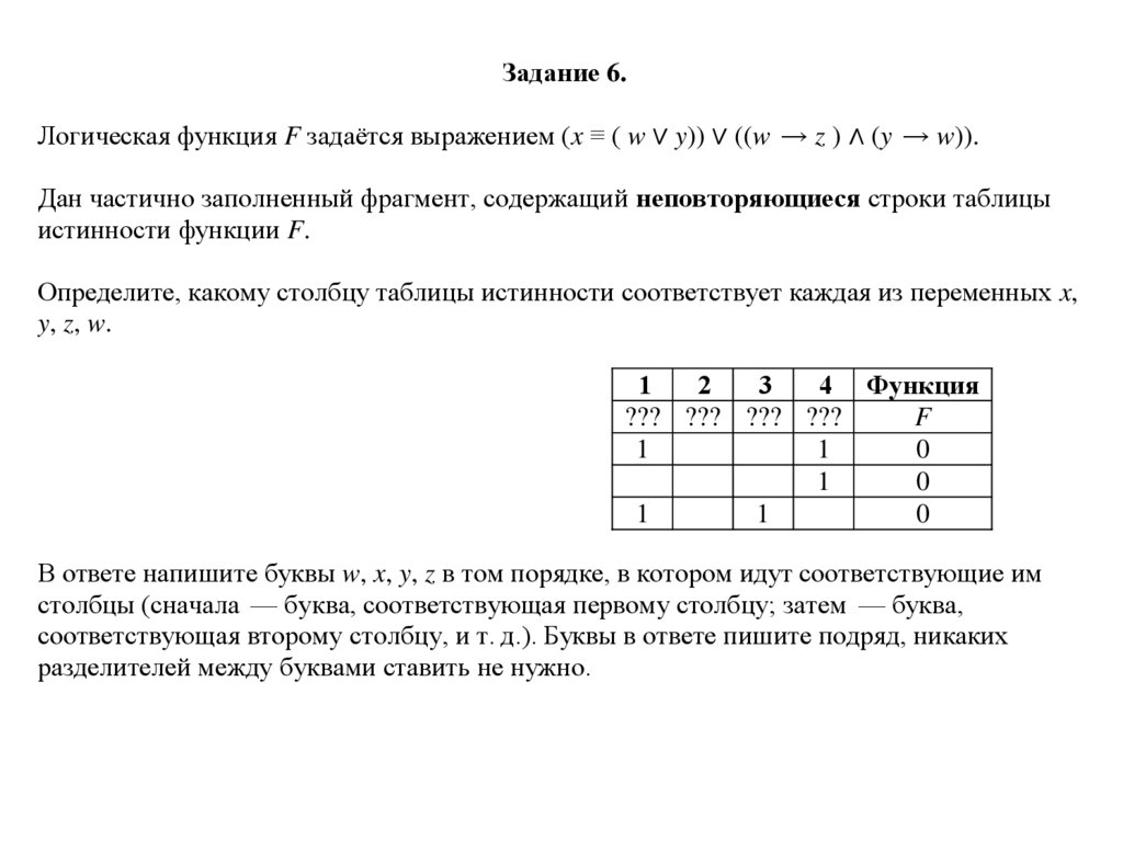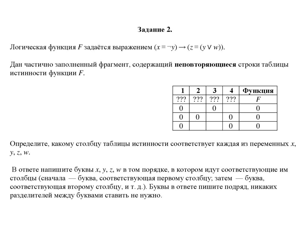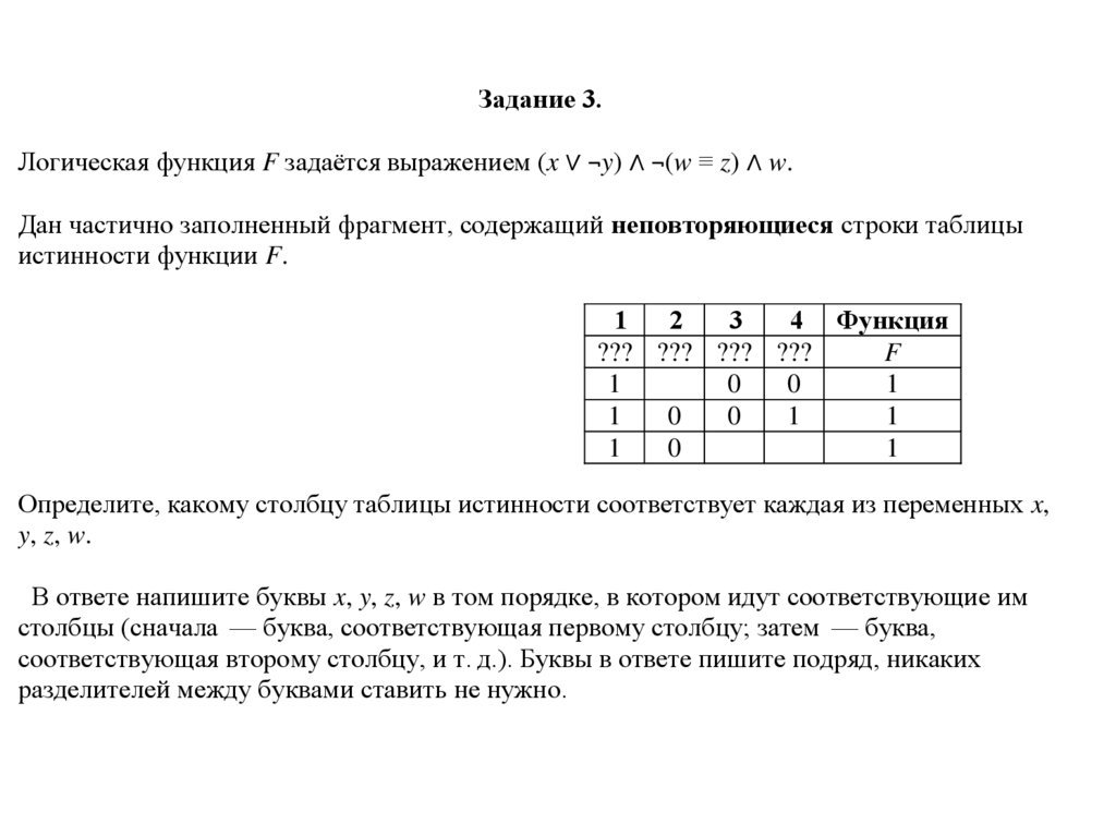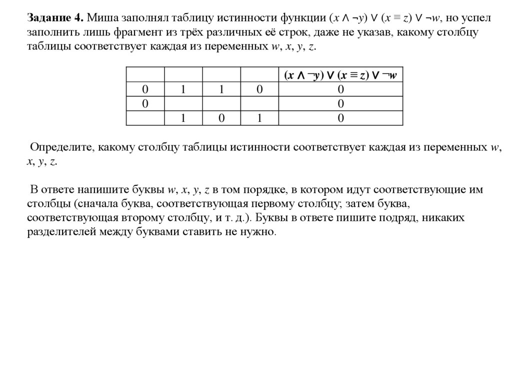 Задание 4. Миша заполнял таблицу истинности функции (x ∧ ¬y) ∨ (x ≡ z) ∨ ¬w, но успелзаполнить лишь фрагмент из трёх различных её строк, даже не указав, какому столбцу