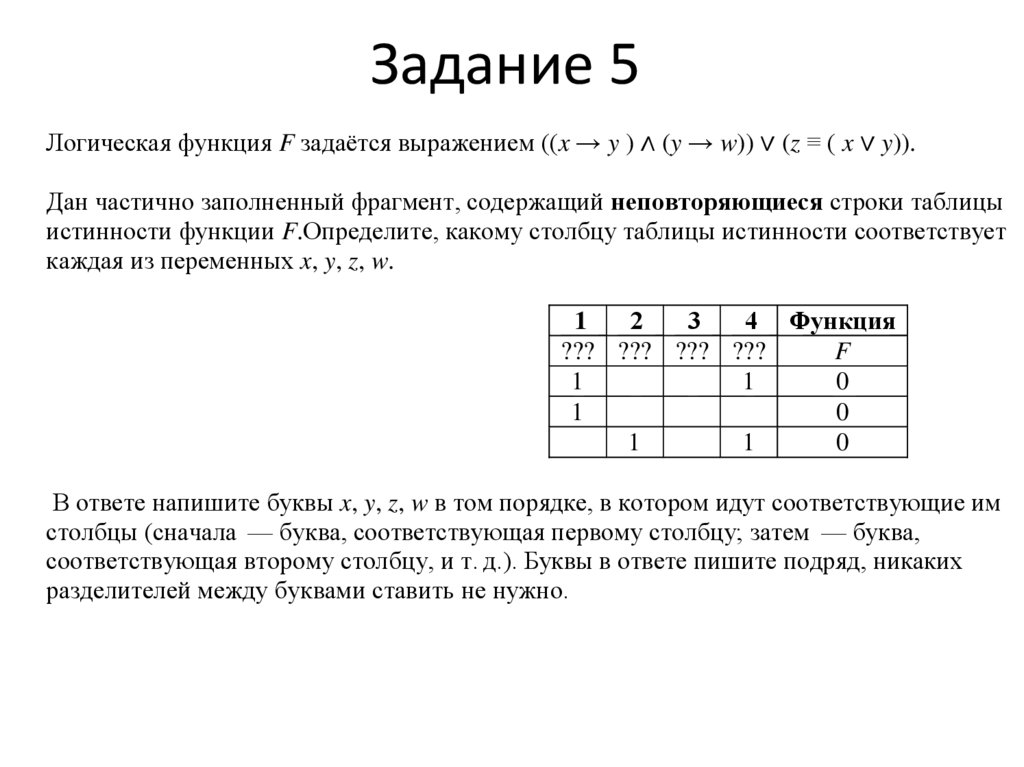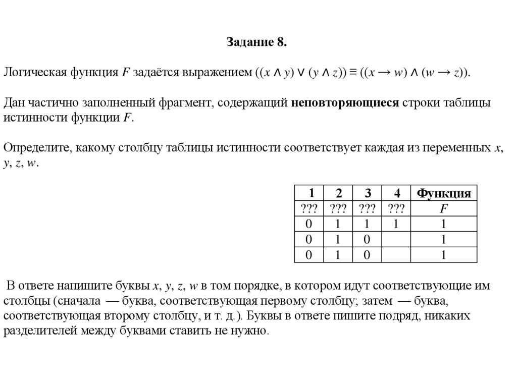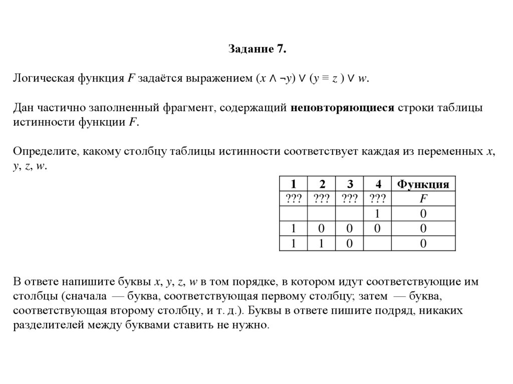 Задание 7.Логическая функция F задаётся выражением (x ∧ ¬y) ∨ (y ≡ z ) ∨ w.