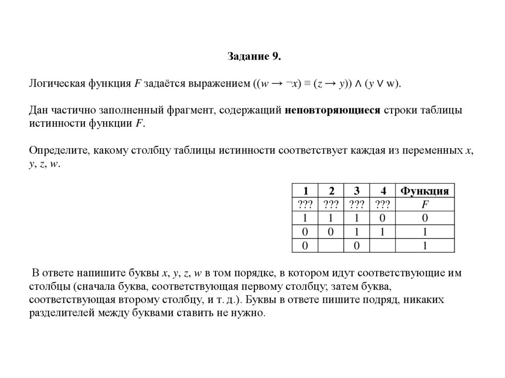 Задание 9.Логическая функция F задаётся выражением ((w → ¬x) ≡ (z → y)) ∧ (y ∨ w).