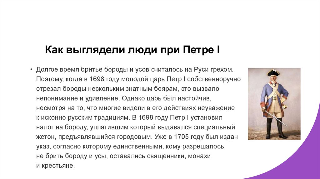 Как выглядели люди при Петре I• Долгое время бритье бороды и усов считалось на Руси грехом.