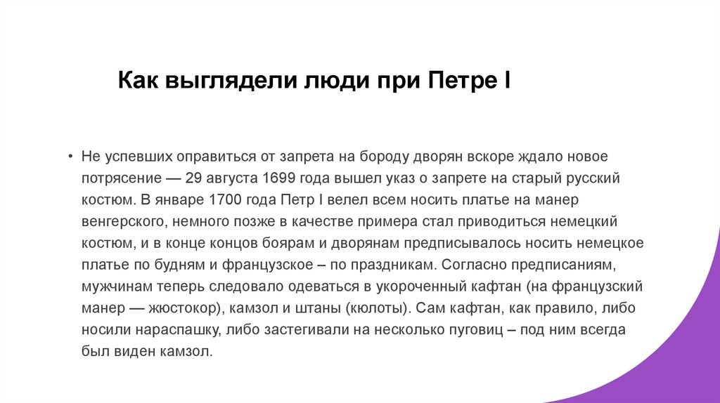 костюм. В январе 1700 года Петр I велел всем носить платье на манер