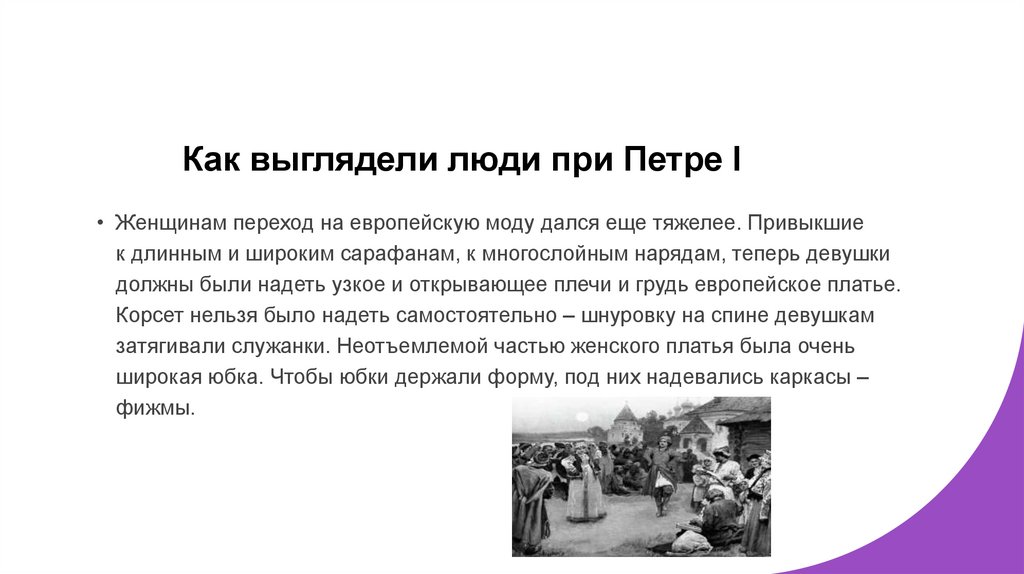 Как выглядели люди при Петре I• Женщинам переход на европейскую моду дался еще тяжелее. Привыкшие