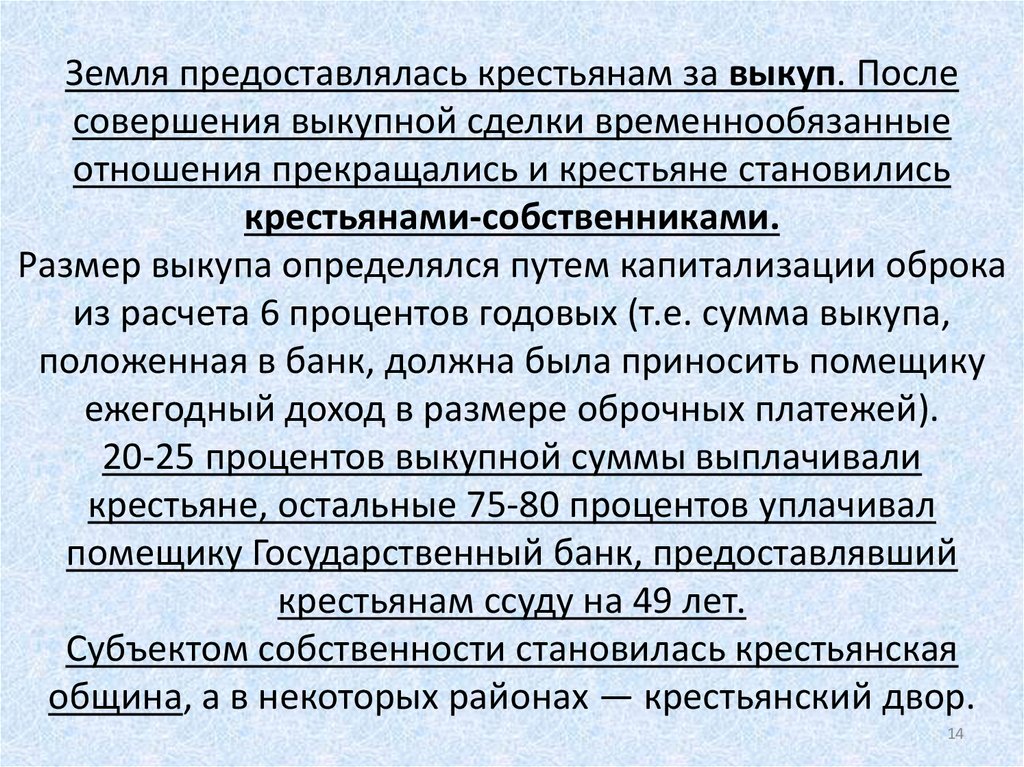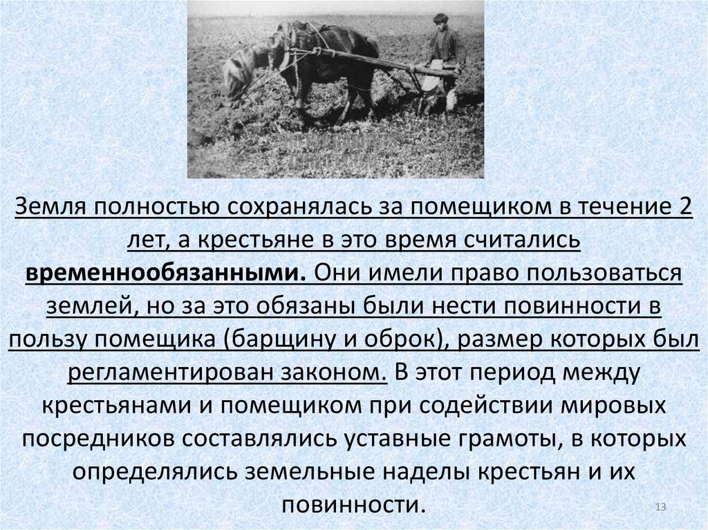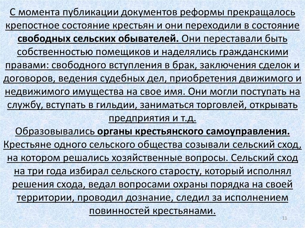 11. С момента публикации документов реформы прекращалось крепостное состояние крестьян и они переходили в состояние свободных