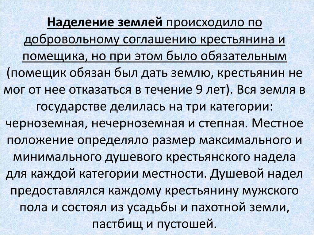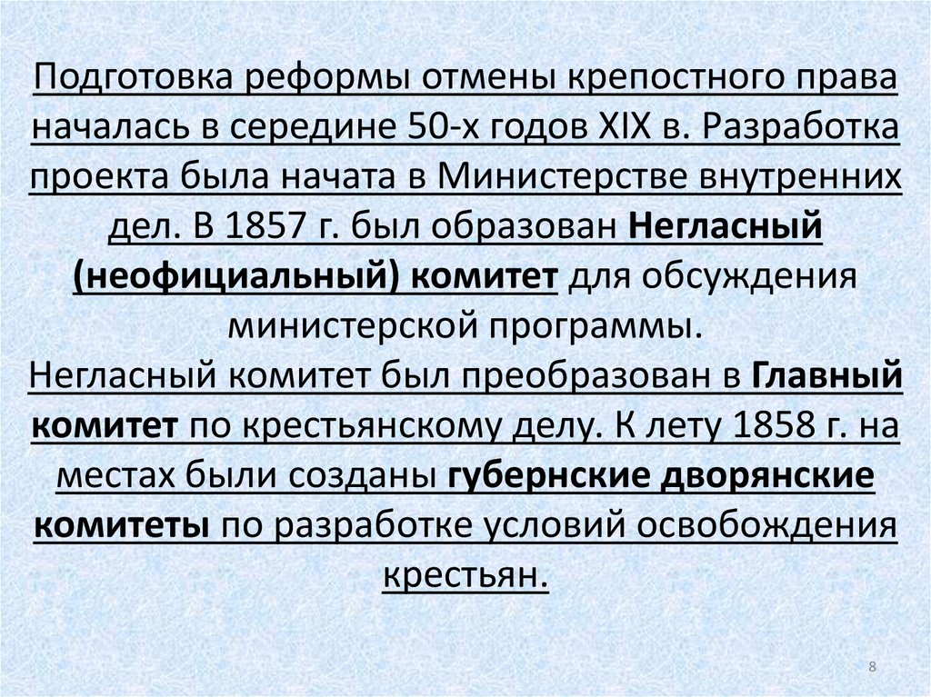 8. Подготовка реформы отмены крепостного права началась в середине 50-х годов XIX в. Разработка проекта была начата в Министерстве