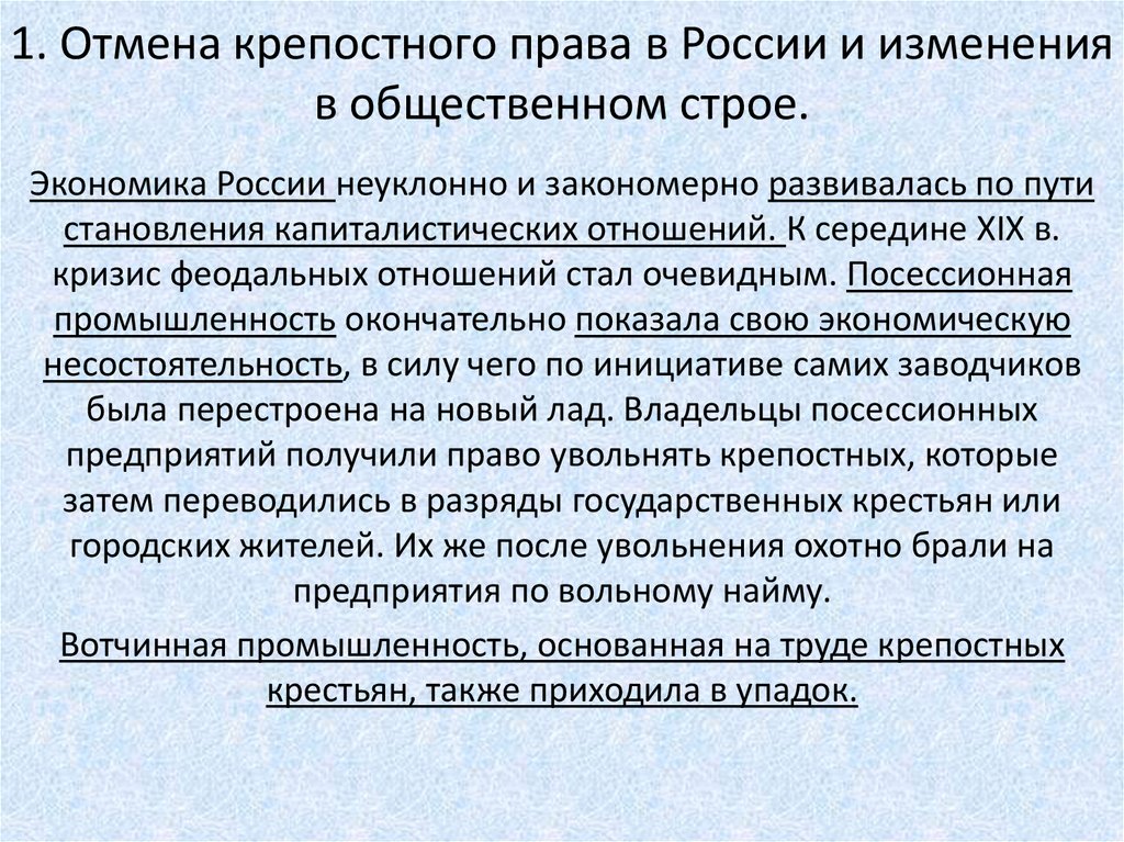1. Отмена крепостного права в России иизменения в общественном строе.