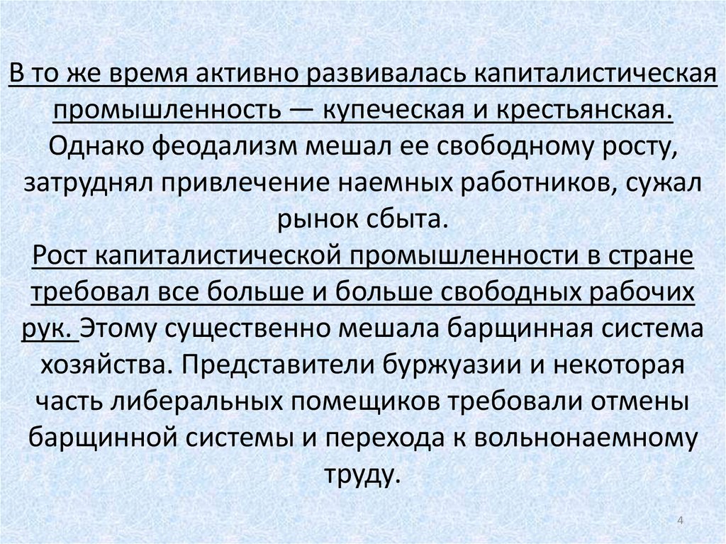 4. В то же время активно развивалась капиталистическая промышленность — купеческая и крестьянская. Однако феодализм мешал ее