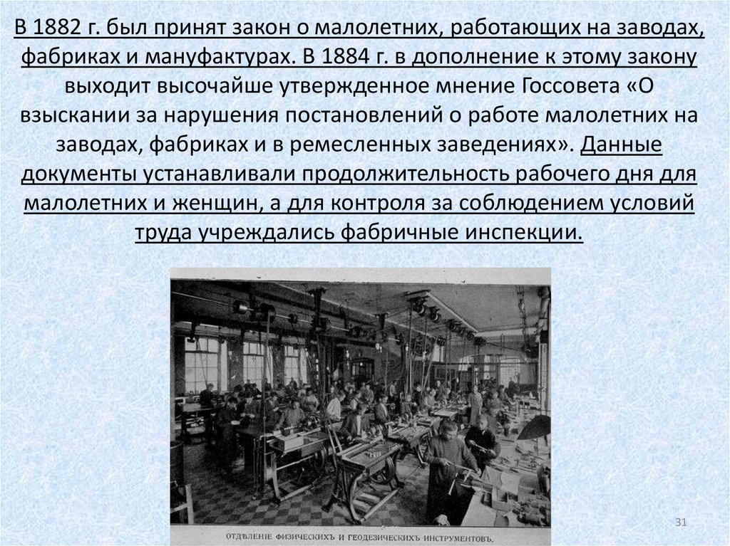 31. В 1882 г. был принят закон о малолетних, работающих на заводах, фабриках и мануфактурах. В 1884 г. в дополнение к этому закону