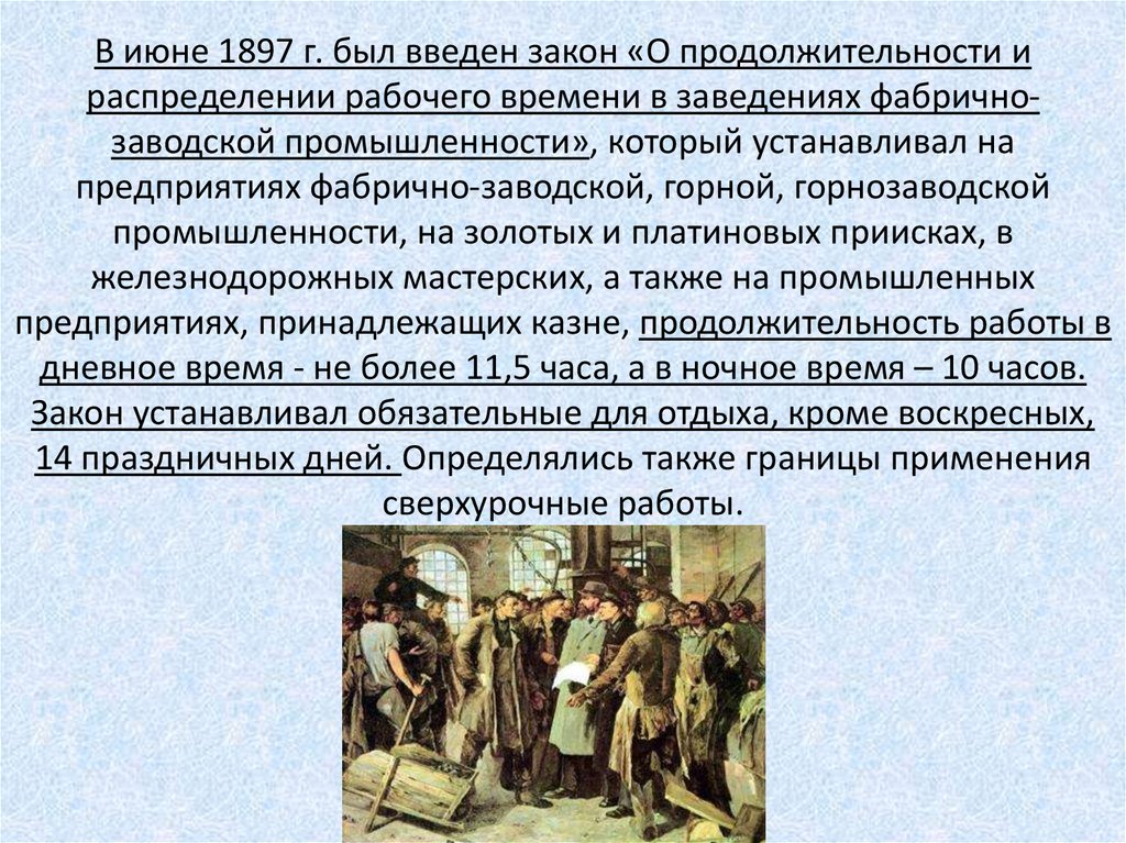 В июне 1897 г. был введен закон «О продолжительности ираспределении рабочего времени в заведениях фабричнозаводской промышленности», который устанавливал на