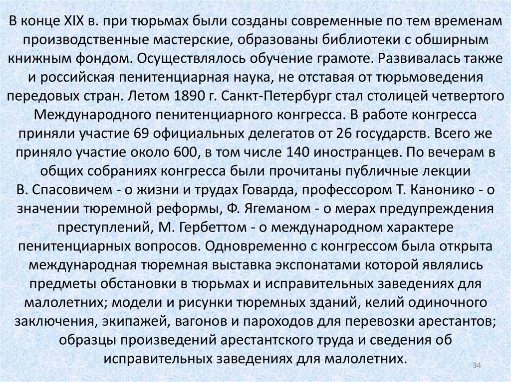 34. В конце XIX в. при тюрьмах были созданы современные по тем временам производственные мастерские, образованы библиотеки с