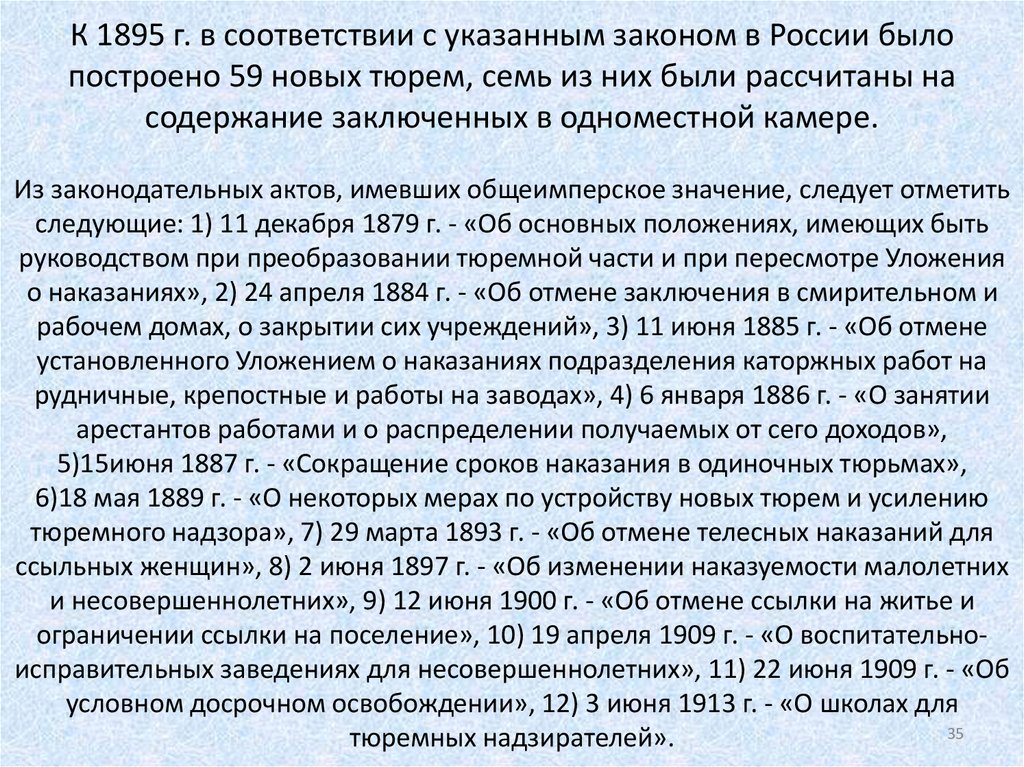 35. К 1895 г. в соответствии с указанным законом в России было построено 59 новых тюрем, семь из них были рассчитаны на содержание