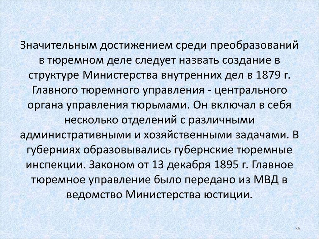 36. Значительным достижением среди преобразований в тюремном деле следует назвать создание в структуре Министерства внутренних дел