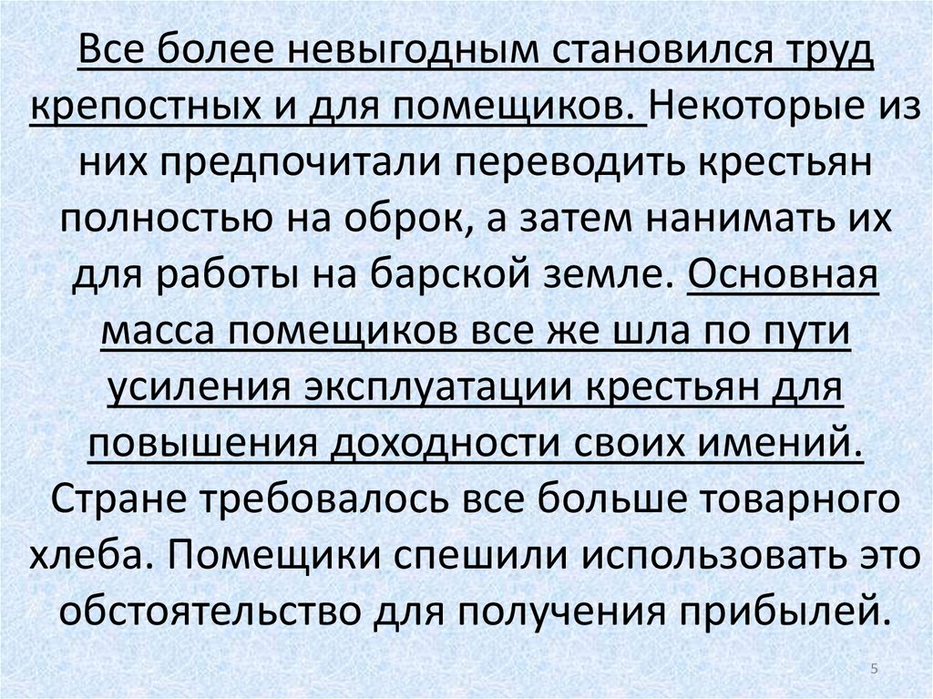 5. Все более невыгодным становился труд крепостных и для помещиков. Некоторые из них предпочитали переводить крестьян полностью на