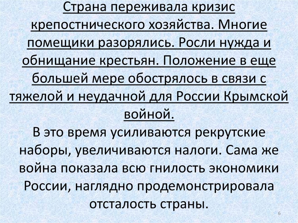 6. Страна переживала кризис крепостнического хозяйства. Многие помещики разорялись. Росли нужда и обнищание крестьян. Положение в