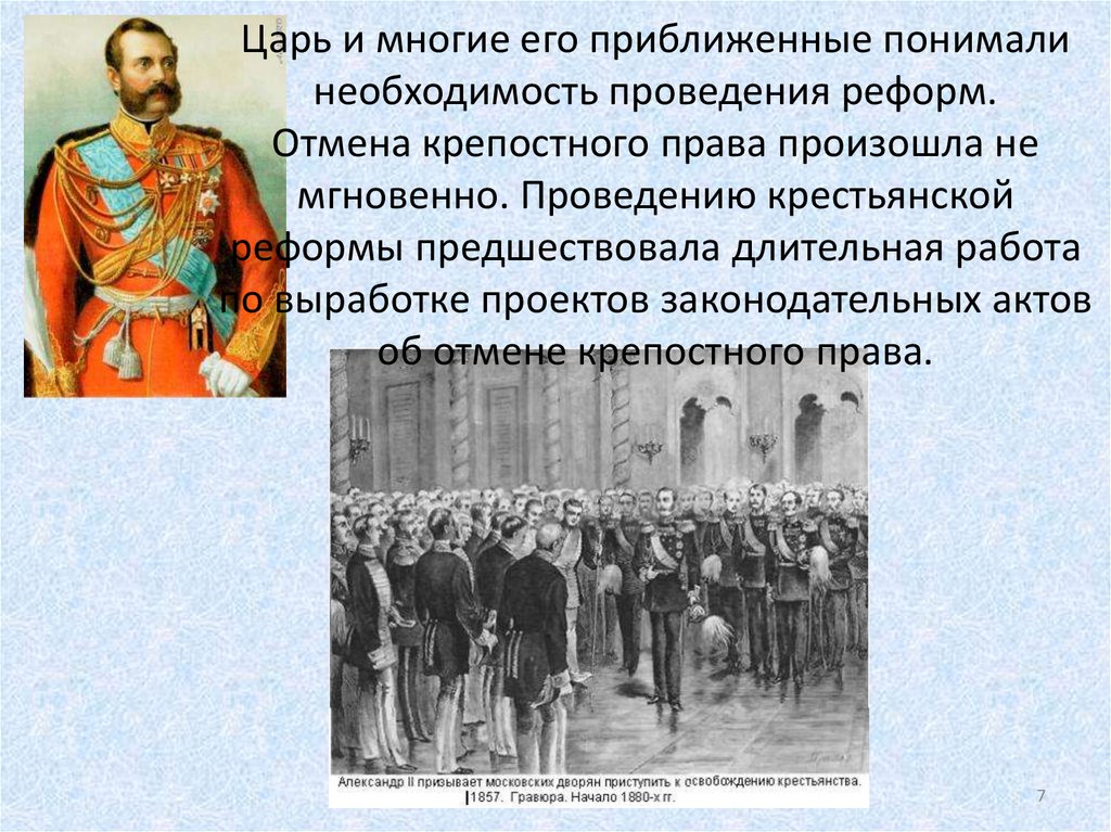 7. Царь и многие его приближенные понимали необходимость проведения реформ. Отмена крепостного права произошла не мгновенно.