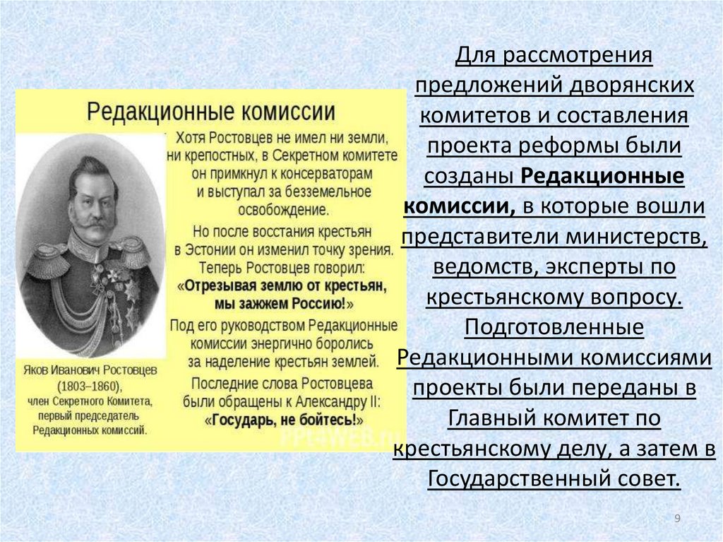 9. Для рассмотрения предложений дворянских комитетов и составления проекта реформы были созданы Редакционные комиссии, в которые