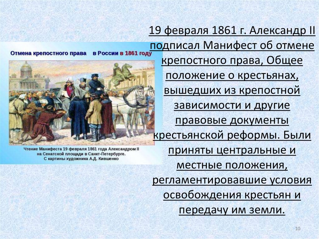 10. 19 февраля 1861 г. Александр II подписал Манифест об отмене крепостного права, Общее положение о крестьянах, вышедших из