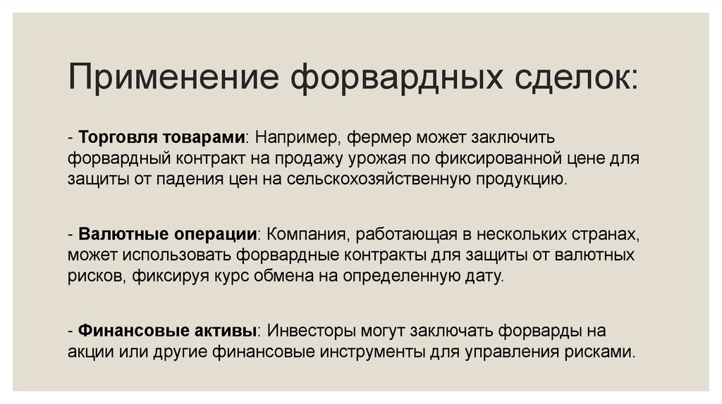 Применение форвардных сделок:- Торговля товарами: Например, фермер может заключить