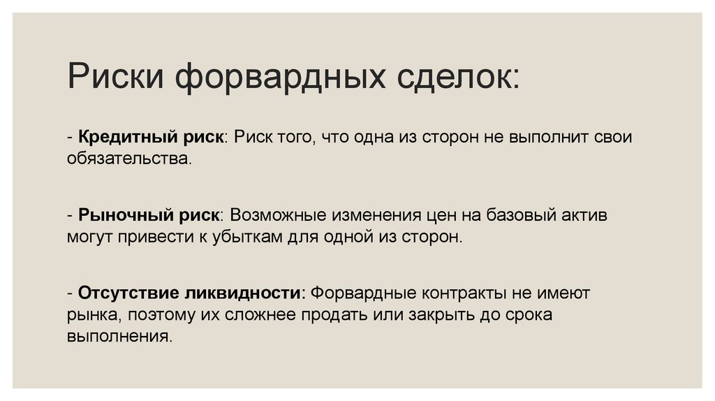 Риски форвардных сделок:- Кредитный риск: Риск того, что одна из сторон не выполнит свои