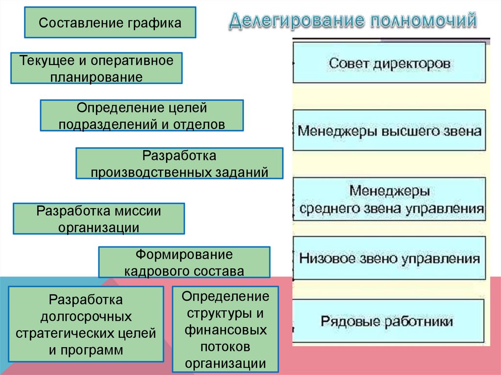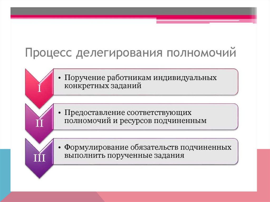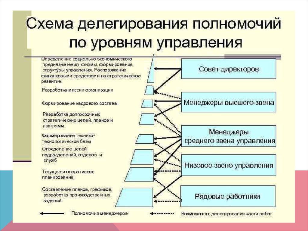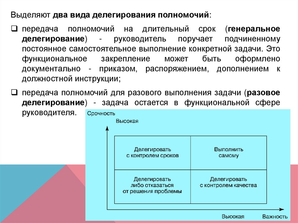 Выделяют два вида делегирования полномочий:передача полномочий на длительный срок (генеральное