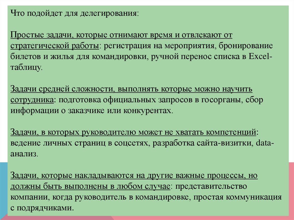 Что подойдет для делегирования:Простые задачи, которые отнимают время и отвлекают от