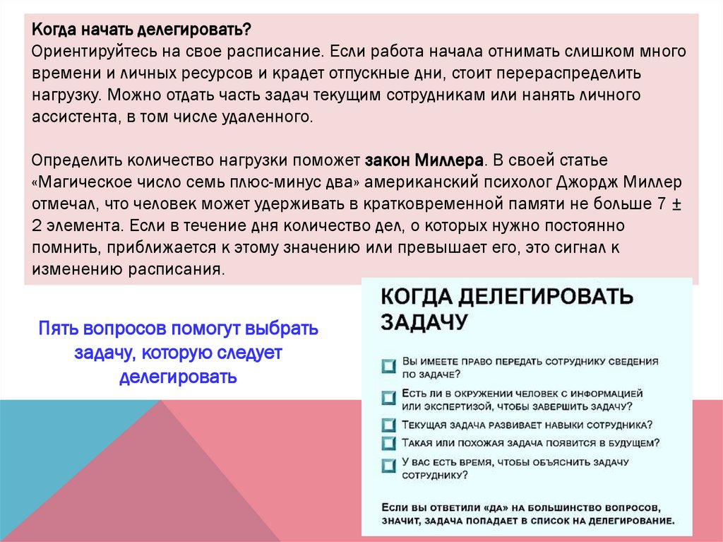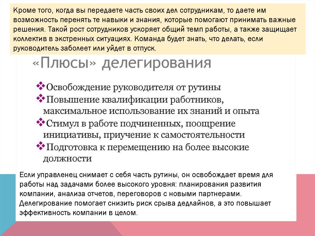 Кроме того, когда вы передаете часть своих дел сотрудникам, то даете имвозможность перенять те навыки и знания, которые помогают принимать важные