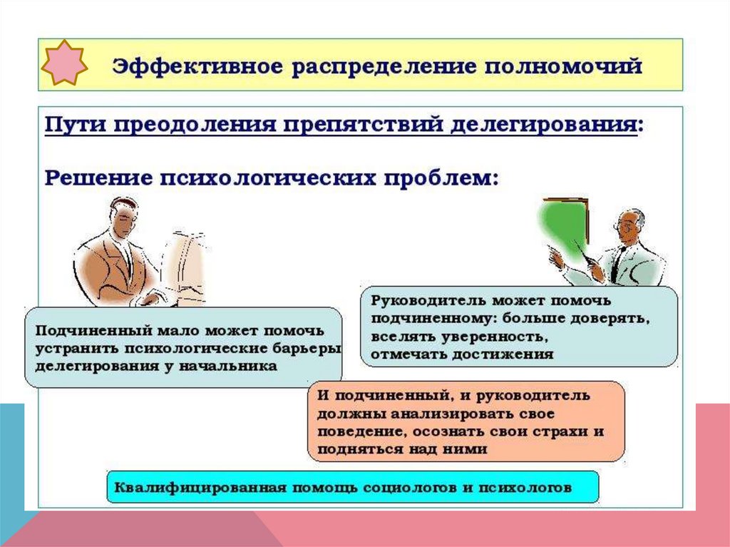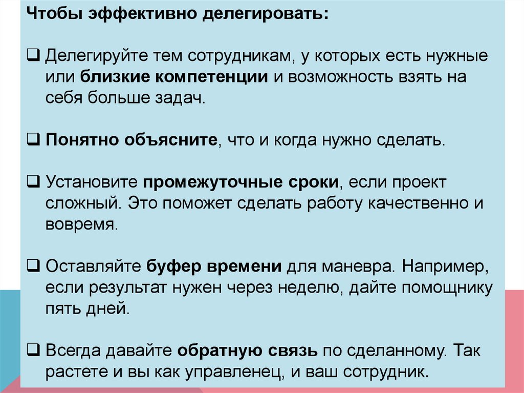 Чтобы эффективно делегировать:Делегируйте тем сотрудникам, у которых есть нужные