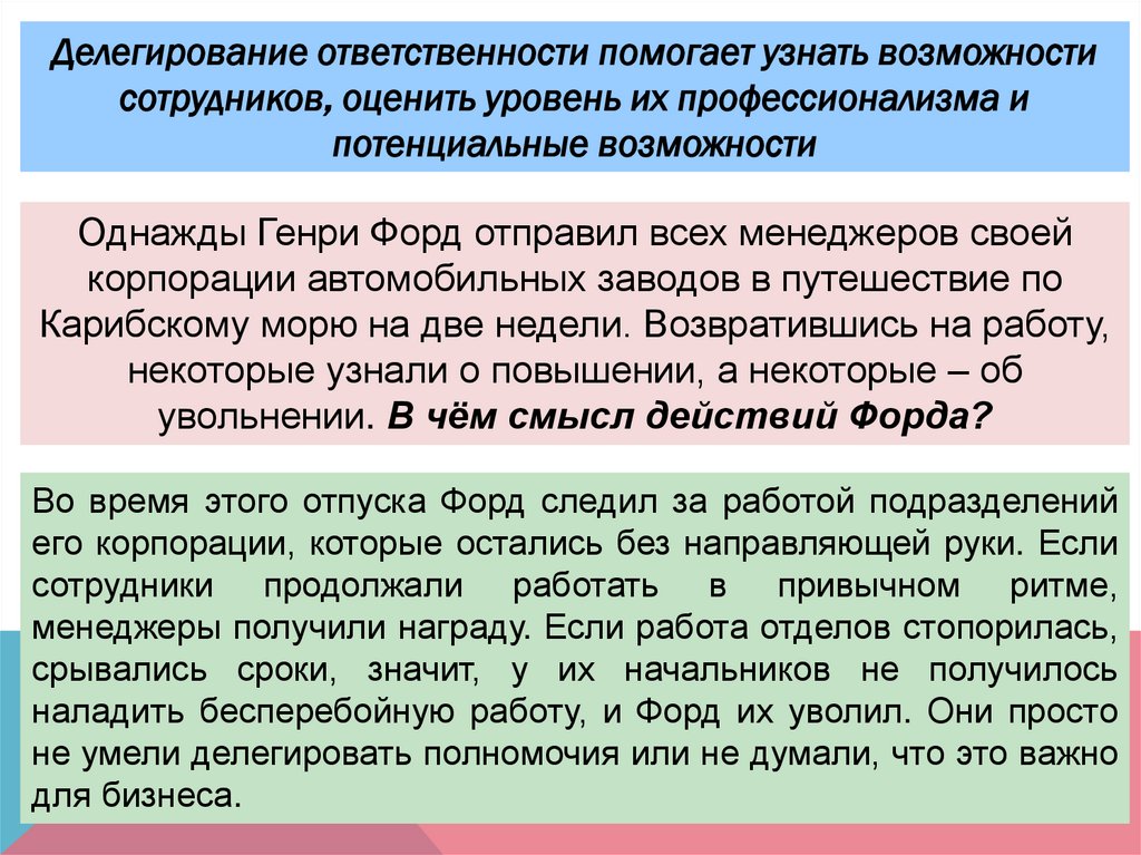 Делегирование ответственности помогает узнать возможностисотрудников, оценить уровень их профессионализма и