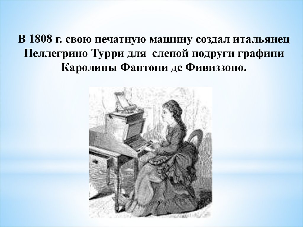 В 1808 г. свою печатную машину создал итальянецПеллегрино Турри для слепой подруги графини
