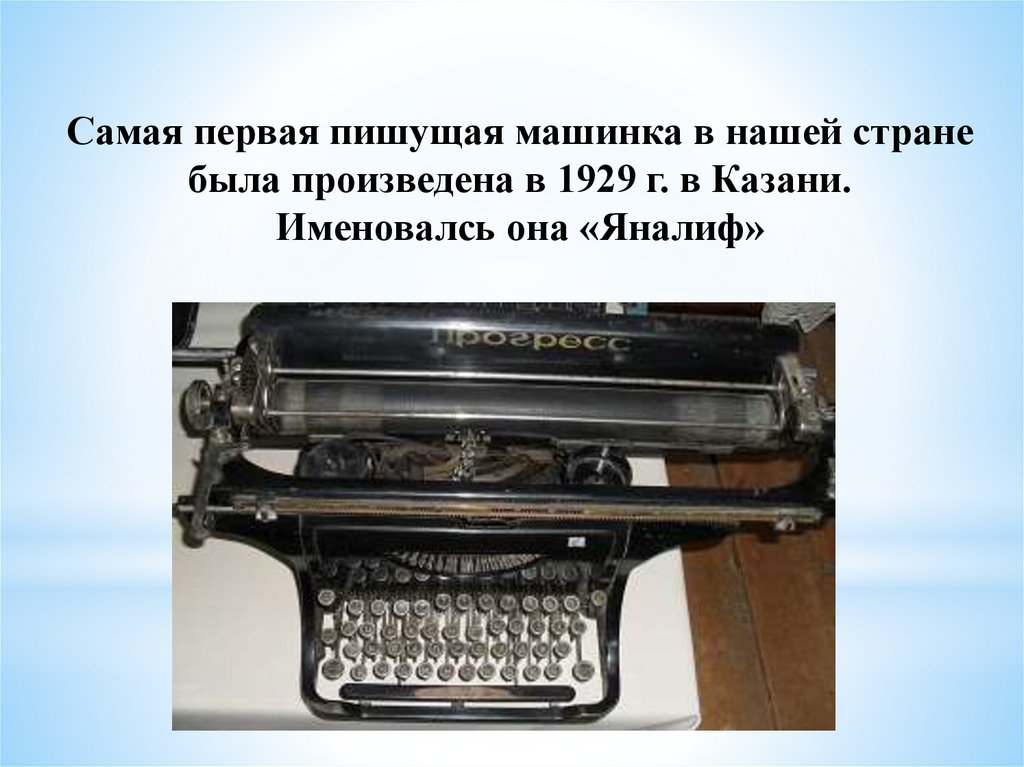 Самая первая пишущая машинка в нашей странебыла произведена в 1929 г. в Казани.