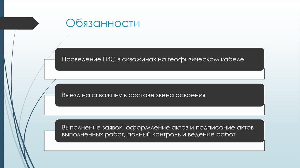ОбязанностиПроведение ГИС в скважинах на геофизическом кабеле
