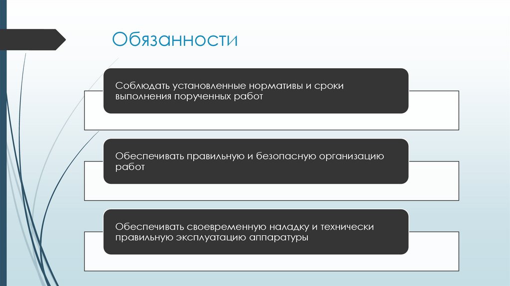 ОбязанностиСоблюдать установленные нормативы и сроки