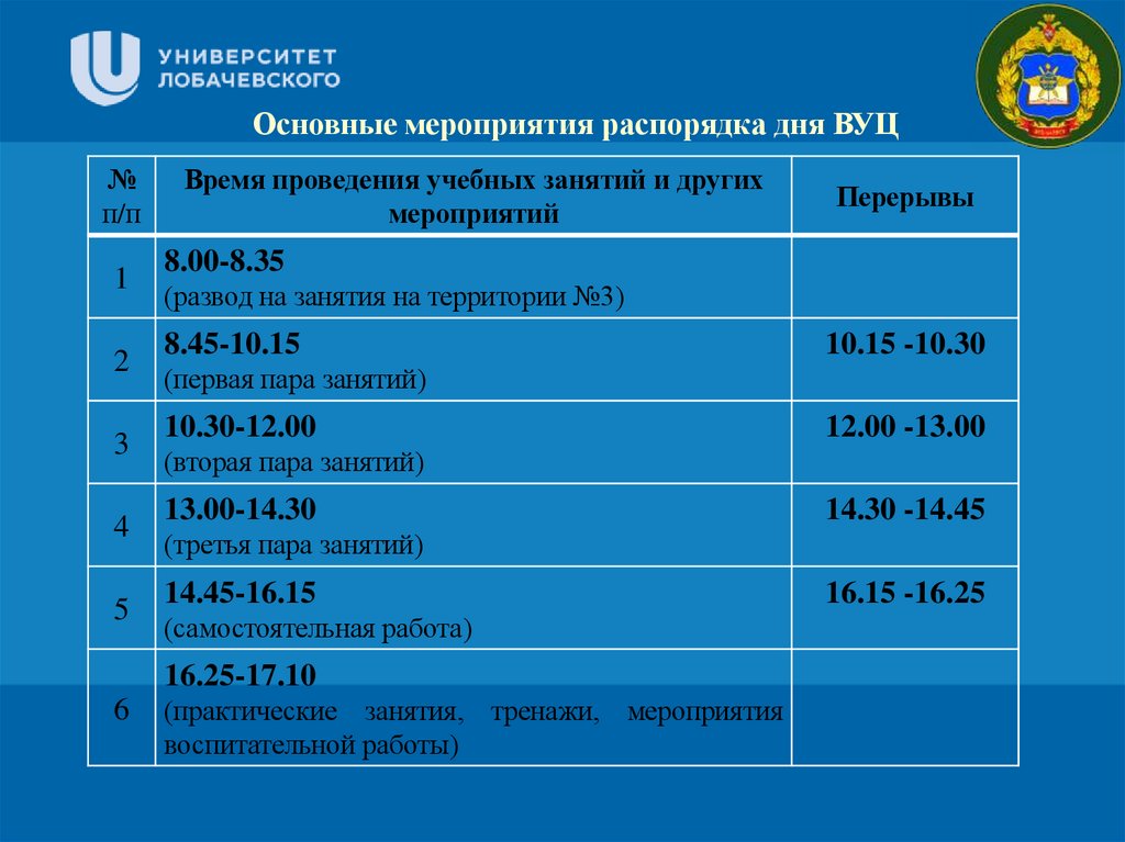 Основные мероприятия распорядка дня ВУЦ