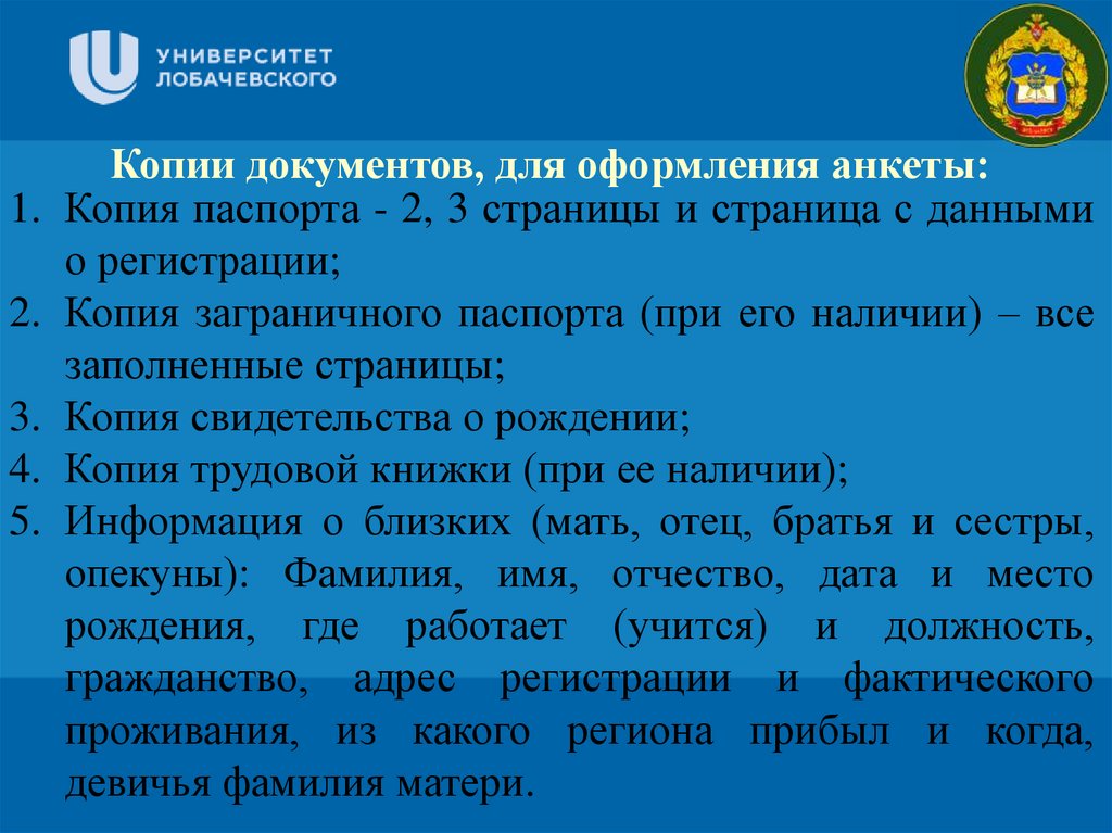Копии документов, для оформления анкеты:1. Копия паспорта - 2, 3 страницы и страница с данными