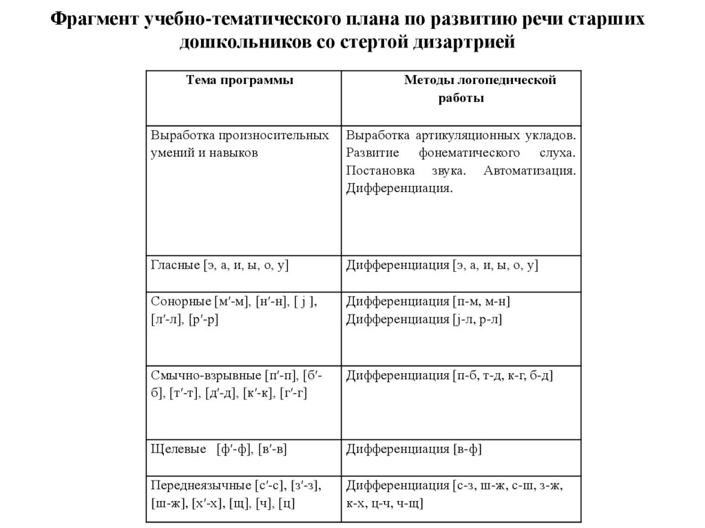 Фрагмент учебно-тематического плана по развитию речи старшихдошкольников со стертой дизартрией
