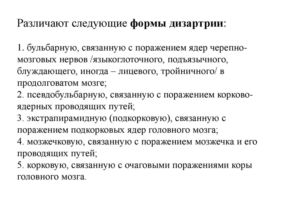 Различают следующие формы дизартрии:1. бульбарную, связанную с поражением ядер черепномозговых нервов /языкоглоточного, подъязычного,