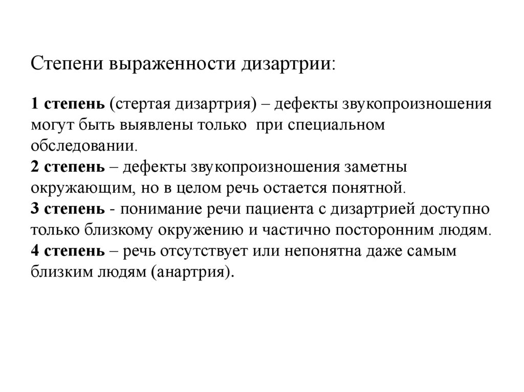 Степени выраженности дизартрии:1 степень (стертая дизартрия) – дефекты звукопроизношения