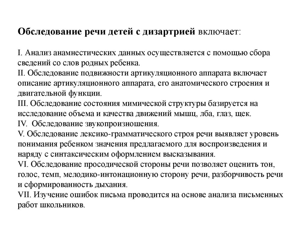 Обследование речи детей с дизартрией включает:I. Анализ анамнестических данных осуществляется с помощью сбора
