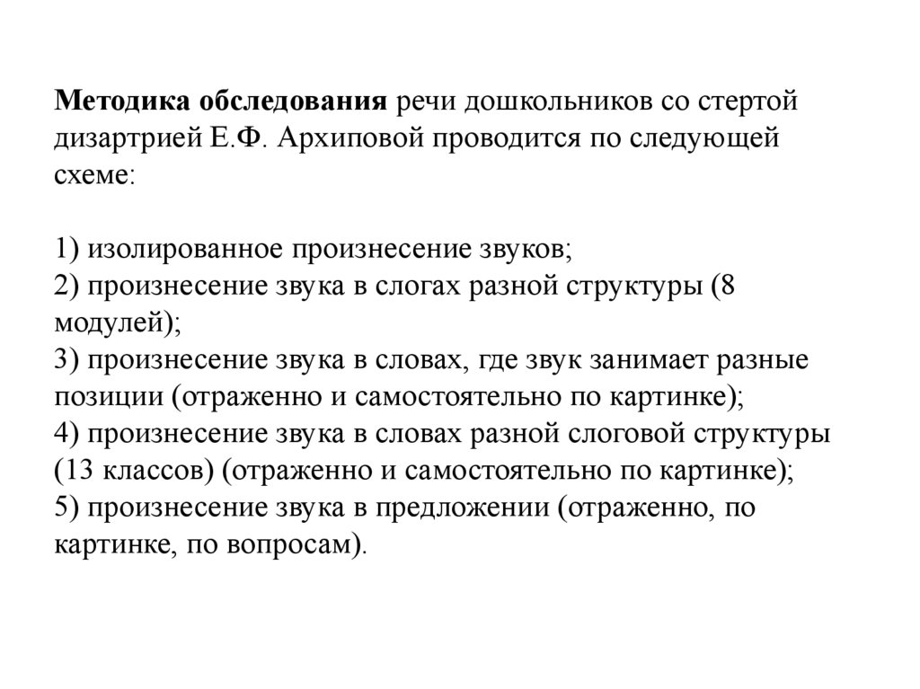 Методика обследования речи дошкольников со стертойдизартрией Е.Ф. Архиповой проводится по следующей