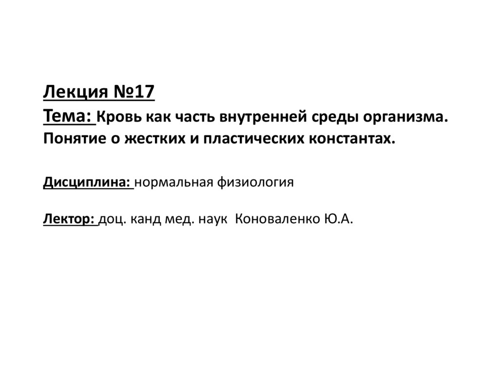 Лекция №17Тема: Кровь как часть внутренней среды организма.