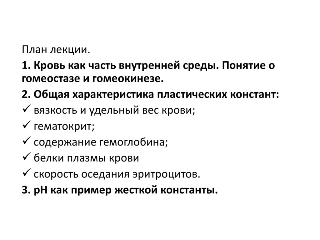 Кровь как часть внутренней среды организма. Понятие о жестких и пластических константах. Лекция №17