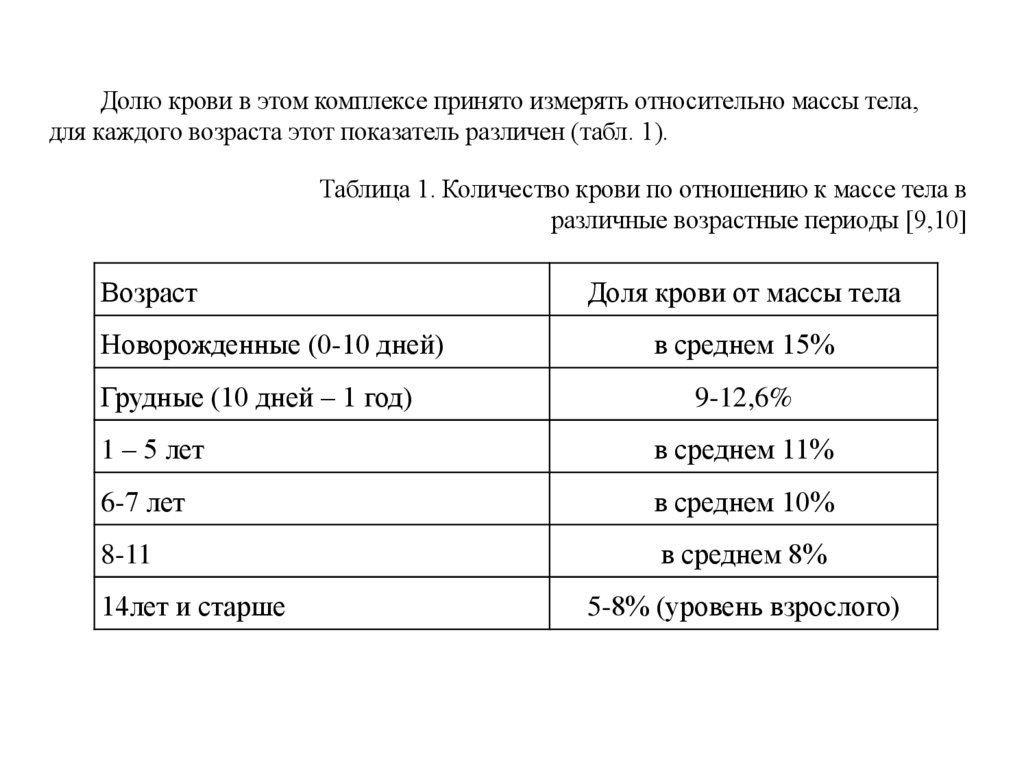 Долю крови в этом комплексе принято измерять относительно массы тела,для каждого возраста этот показатель различен (табл. 1).