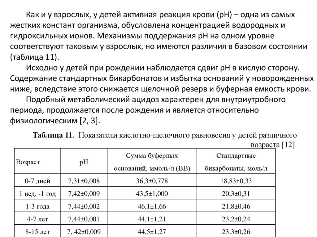 Как и у взрослых, у детей активная реакция крови (рН) – одна из самыхжестких констант организма, обусловлена концентрацией водородных и
