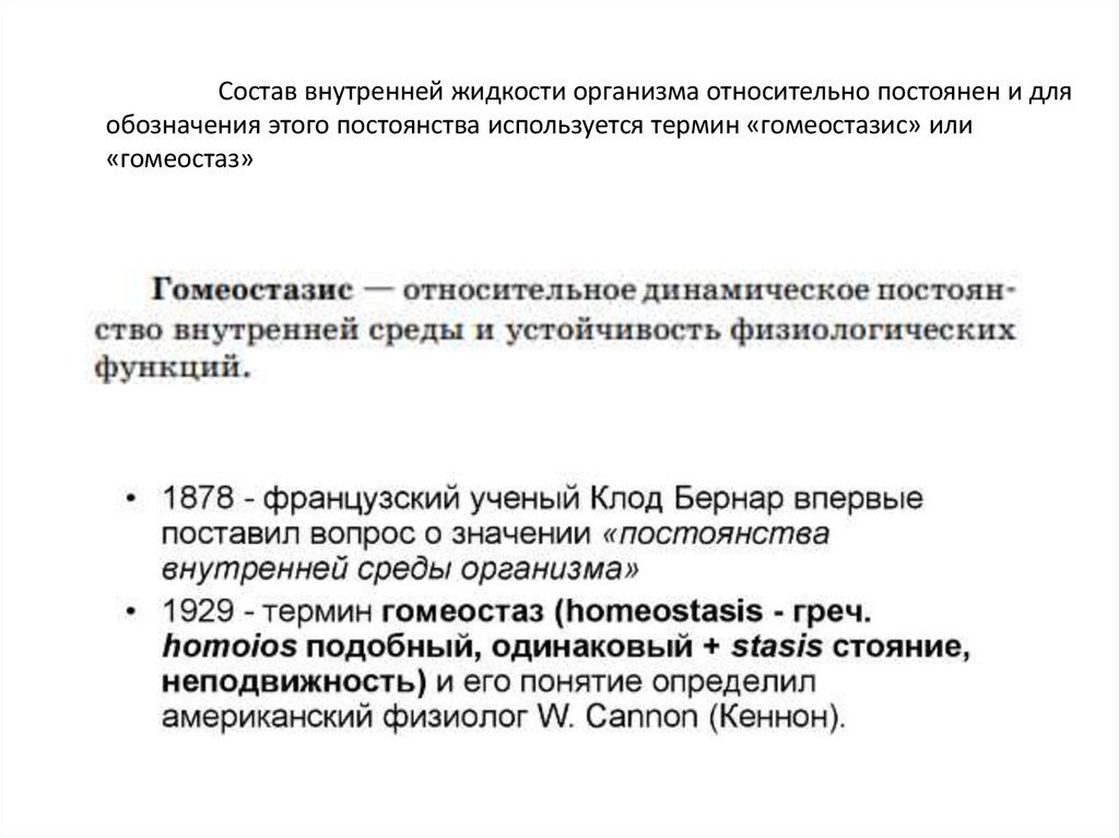 Состав внутренней жидкости организма относительно постоянен и дляобозначения этого постоянства используется термин «гомеостазис» или
