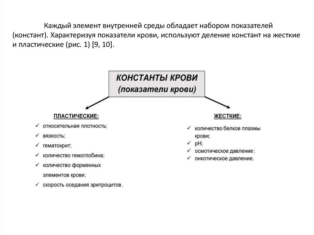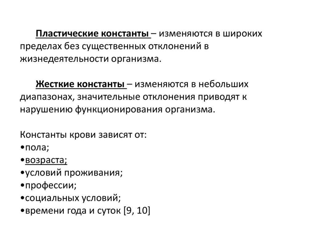 Каждый элемент внутренней среды обладает набором показателей(констант). Характеризуя показатели крови, используют деление констант на жесткие
