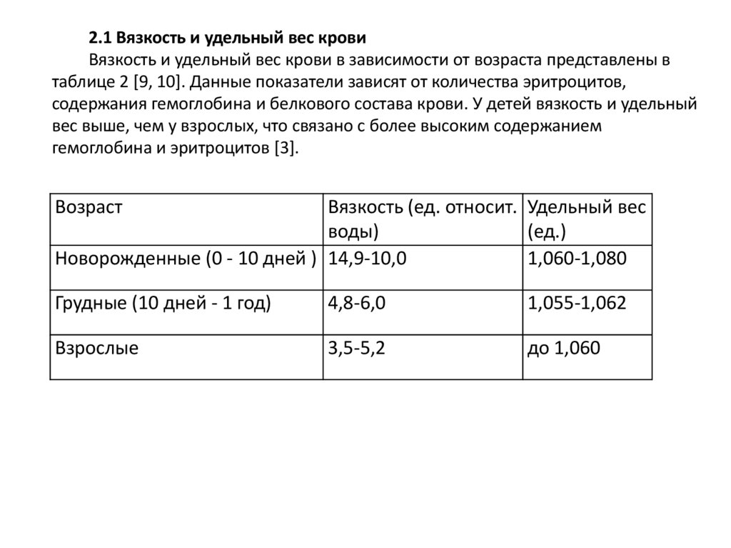 2.1 Вязкость и удельный вес кровиВязкость и удельный вес крови в зависимости от возраста представлены в