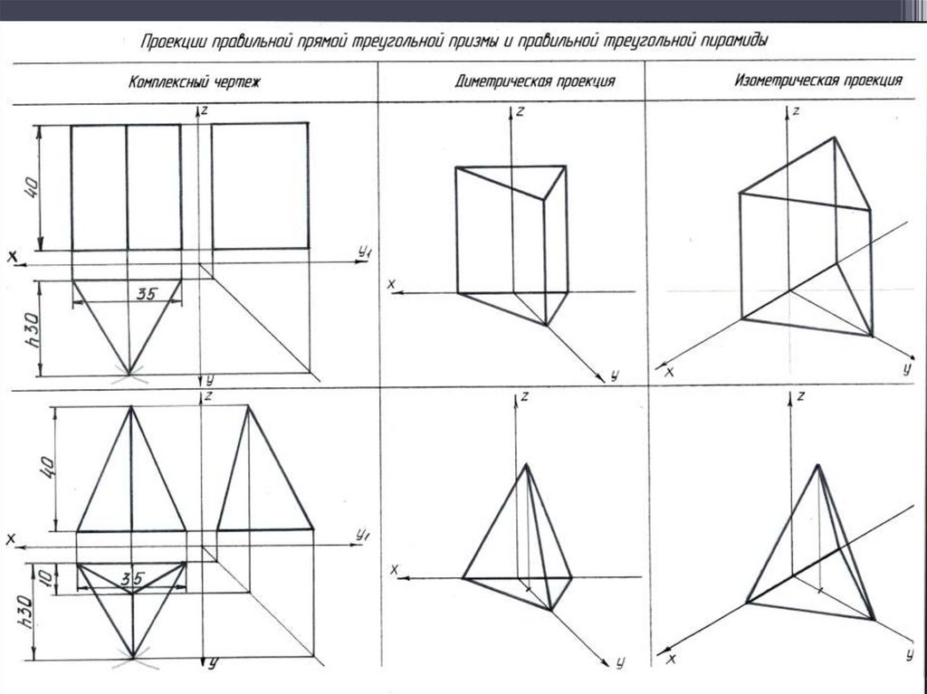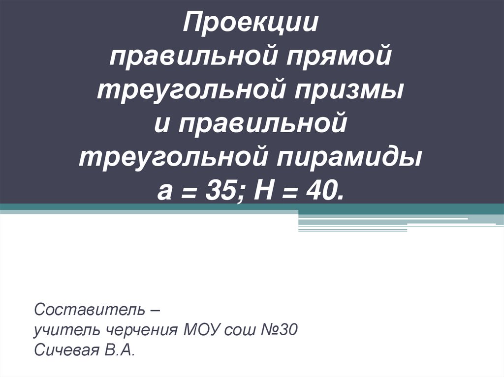 1. Проекции правильной прямой треугольной призмы и правильной треугольной пирамиды a = 35; H = 40.