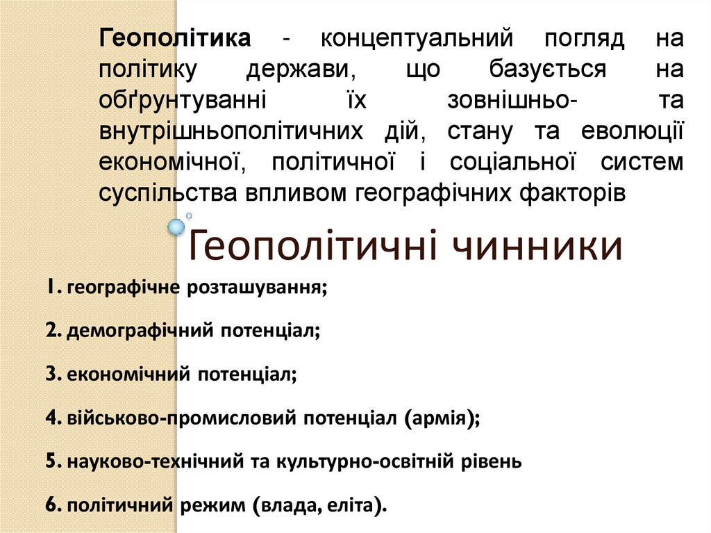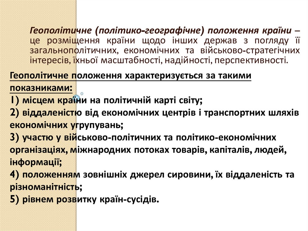 Геополітичне (політико-географічне) положення країни –це розміщення країни щодо інших держав з погляду її